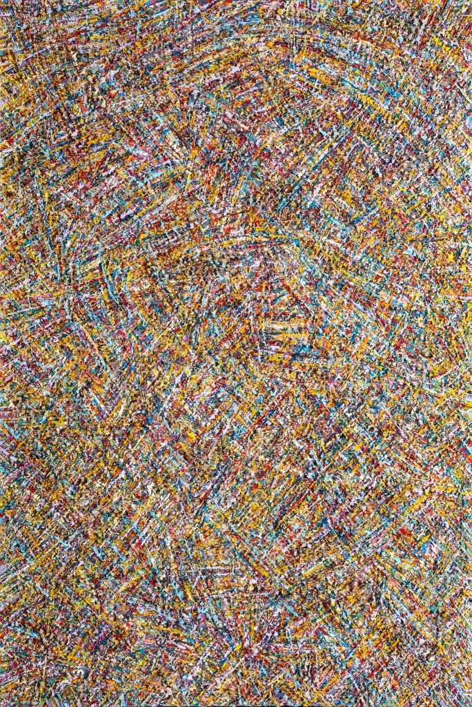 D’une manière générale, mes goûts musicaux se portent naturellement vers le rock, mais lorsqu’il s’agit de peinture, je sélectionne plutôt des musiques électroniques et répétitives qui me servent de support pour entrer dans un rythme, trait à trait, un voyage commence par le biais de la transe induite par le geste renouvelé. Je laisse la place à mon autre « moi » qui restitue les émotions qui l’ont traversé. Il m’est parfois nécessaire de commencer la toile avec un dessin, un sujet qui sert de support à mon voyage. Je reste sur la ligne, recouvrant le dessin sans m’occuper des valeurs et des modelés. Je reste sur le graphisme que je répète dans des alignements de touches inégales et d’épaisseurs variables. La lumière, selon son orientation, modifie profondément le