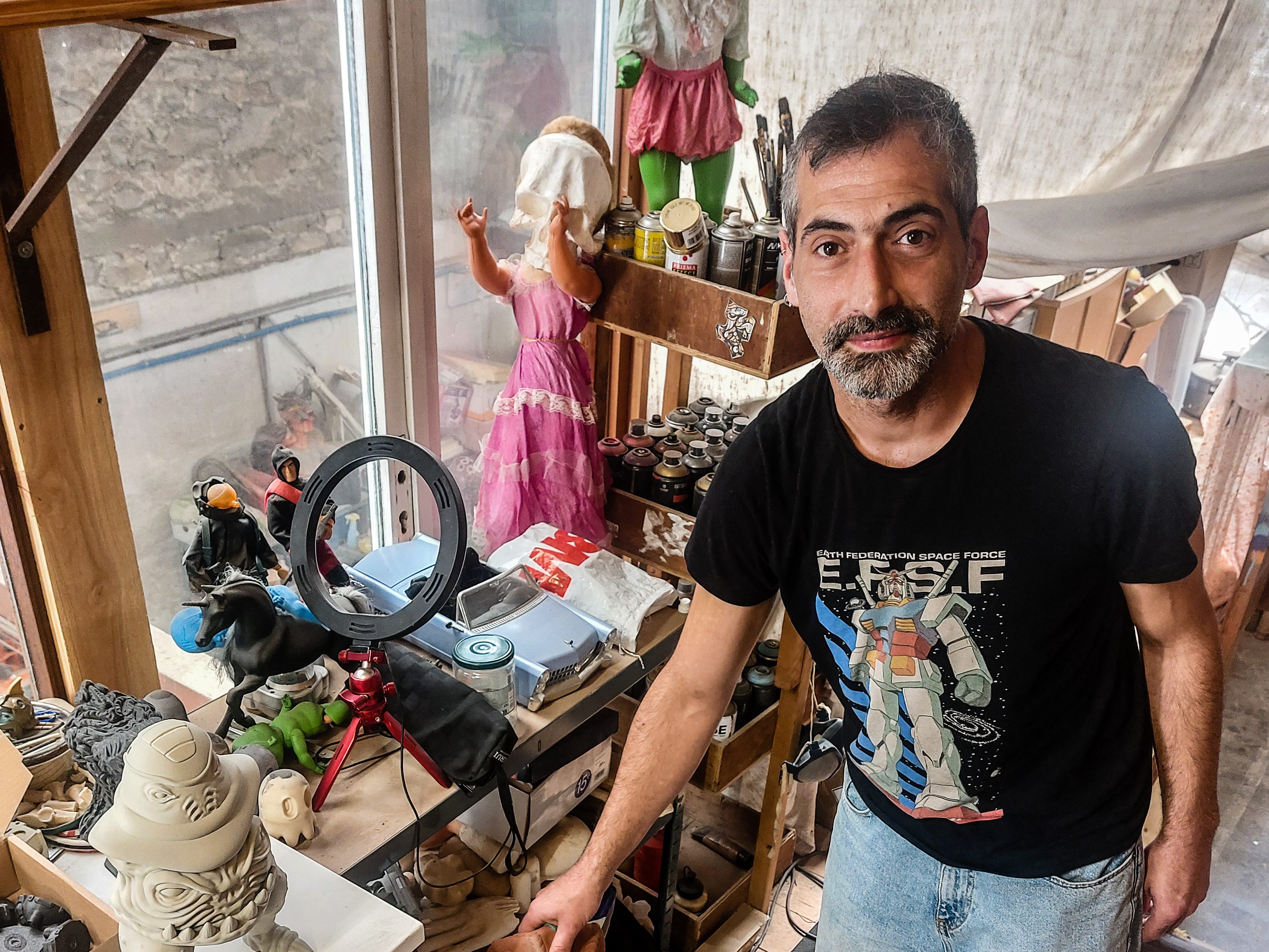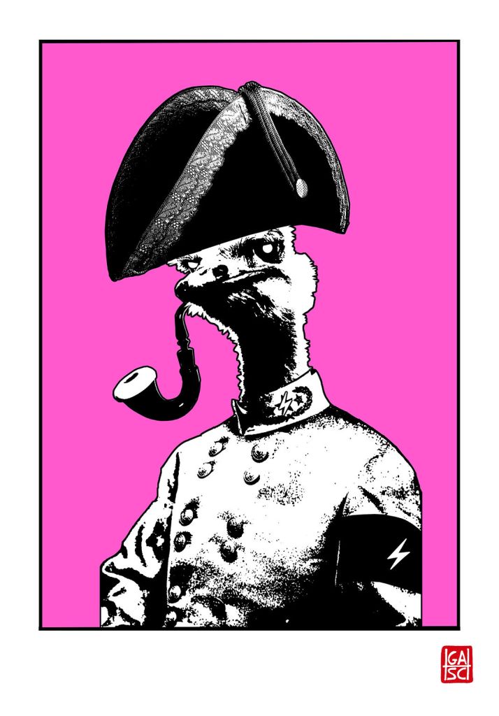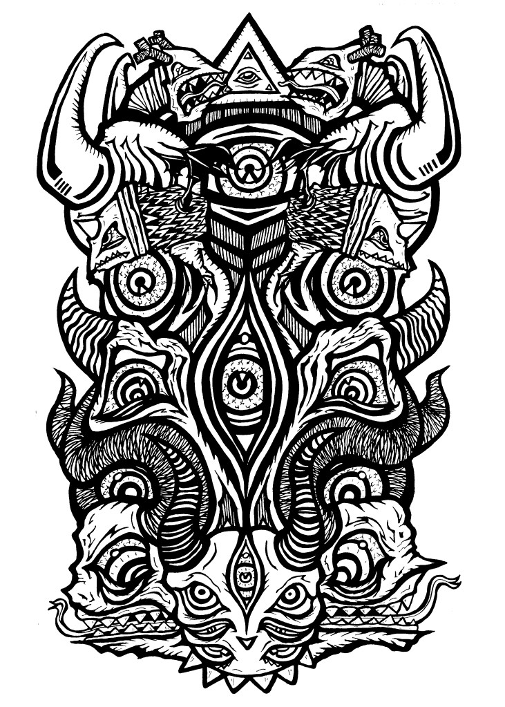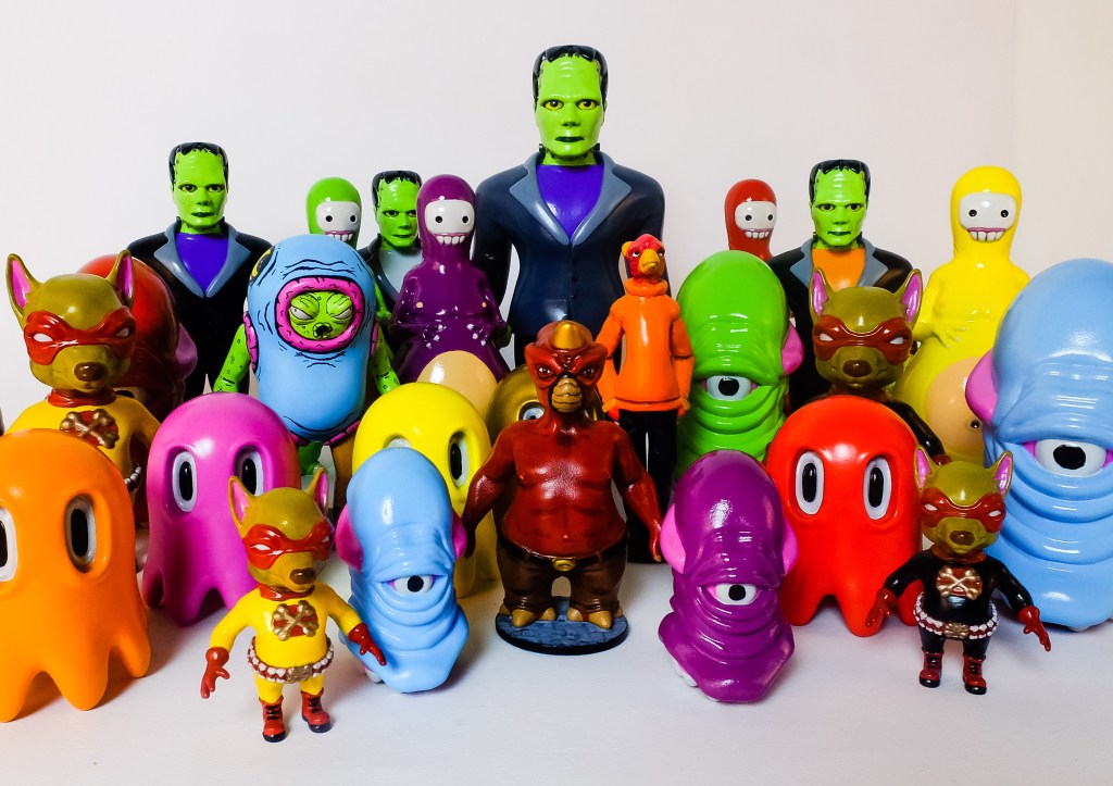 Il explore différents univers graphiques, déclinés en série autour de thématiques, qu’il met en forme en utilisant au gré des besoins l’acrylique, la bombe, la sérigraphie, le modelage 3D, le custom d’objets. Le jeu de contraste est en ligne de fond dans ses œuvres où derrière une esthétique quelque peu naïve et acidulé l’ombre d’Éros et Thanatos n’est jamais loin.